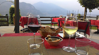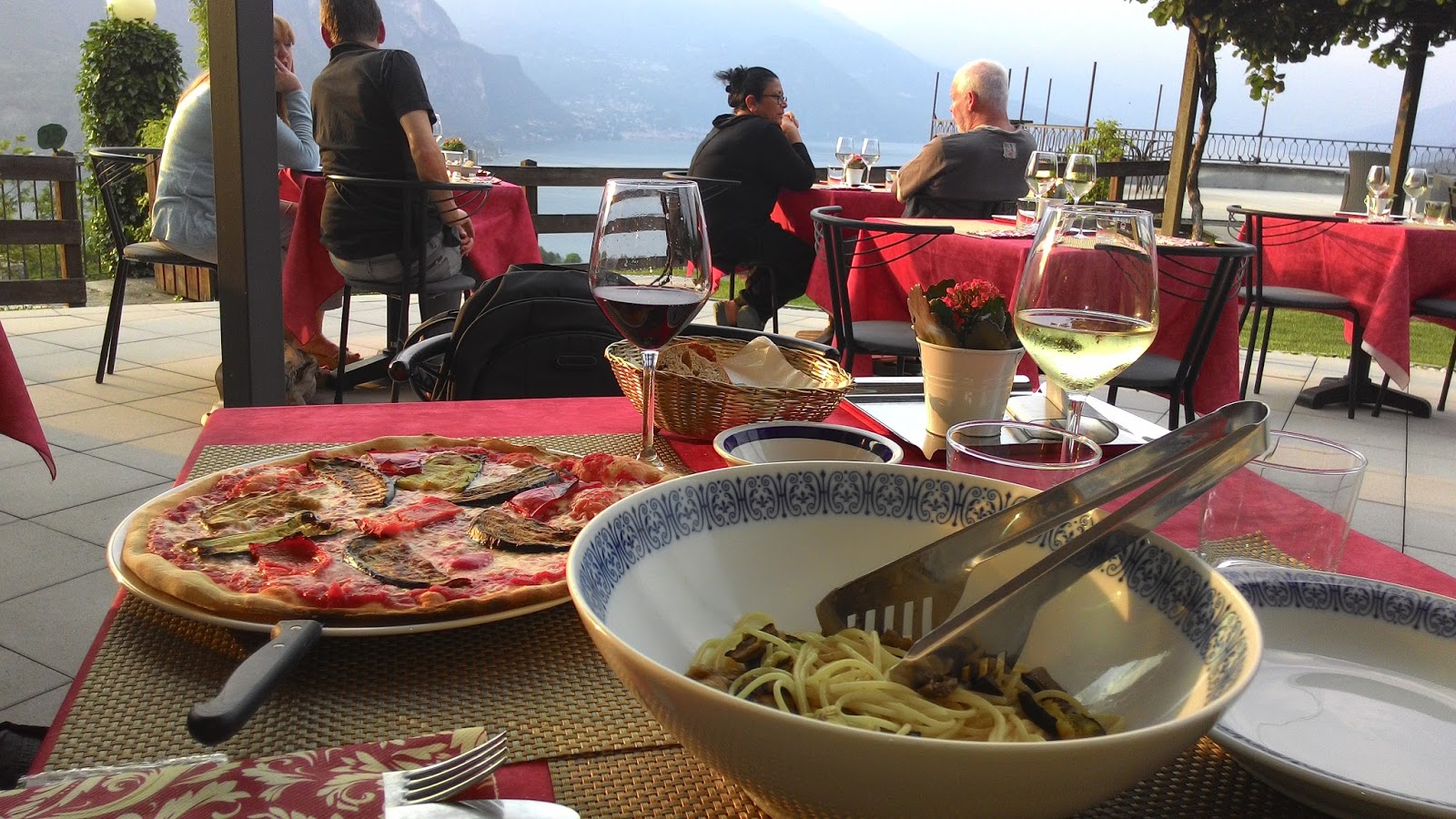 晚餐我們就在飯店內一邊看著湖景一邊享用,兩杯酒,麵包,前菜,一個披薩加上一個義大利麵總共24歐,經濟實惠,只是這個蛋醬的義大利麵吃起來有點膩,不如蔬菜披薩爽口。