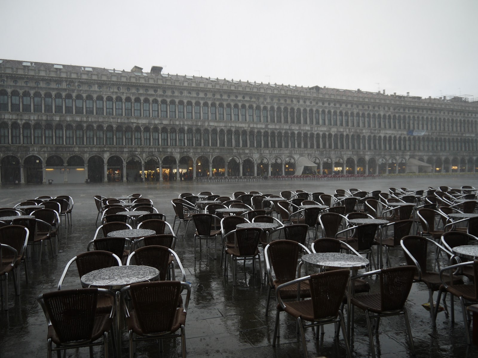逛完博物館,就是下午茶時間了,花神咖啡館就在樓下,來到威尼斯,沒有去體驗一下,就太可惜了,才剛在廣場的座位坐下正要開始點餐,侍者一邊望著天空,一邊比比裡面,我們就換位子到騎樓下了,相信他們都有很豐富的觀測經驗。