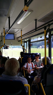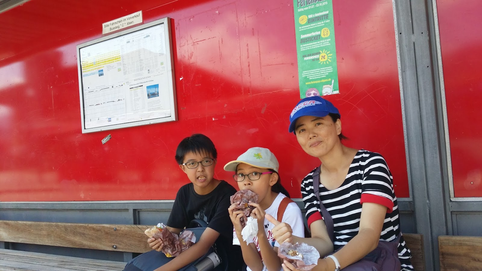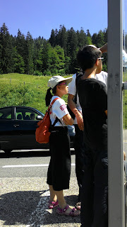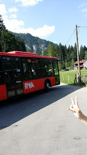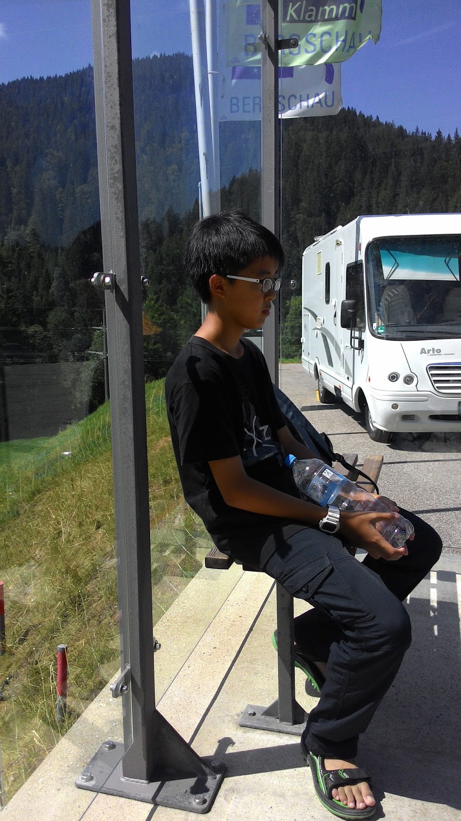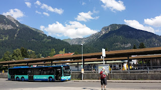 大概十幾分鐘,下一班車來,這個司機說不是在這邊,是在對面,小孩都快瘋了,後來又問了路人,一直到了不知道第5還是第6台車,我們才釐清原來是要先坐到一個城鎮Oberstdorf (我們是坐到Bahnhof火車站的意思),再從那裏轉車回到Breitachklamm Kasse 1,都是1號車但是會到不同的地方,所以要先去確認清楚,不然一坐就會到奧地利了。
